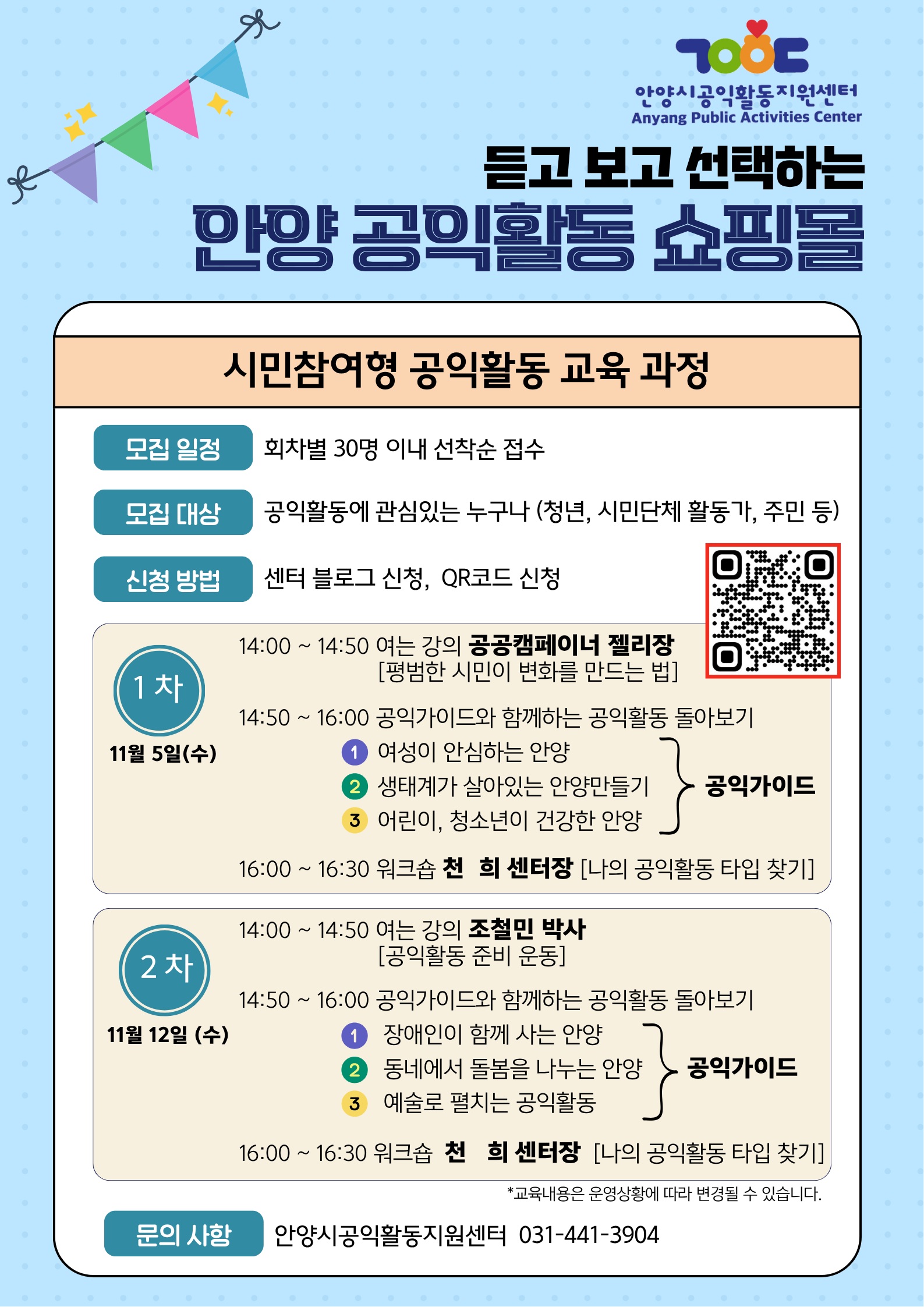안양 공익활동 쇼핑몰 ○시민참여형 공익활동 교육 ○교육일정: 1차 ? 11.5.(수)/ 2차 ? 11.12.(수) ○공익활동에 관심있는 누구나, 차수별 개별 신청 가능 ○문의 : 안양시 공익활동지원센터 031-441-3904