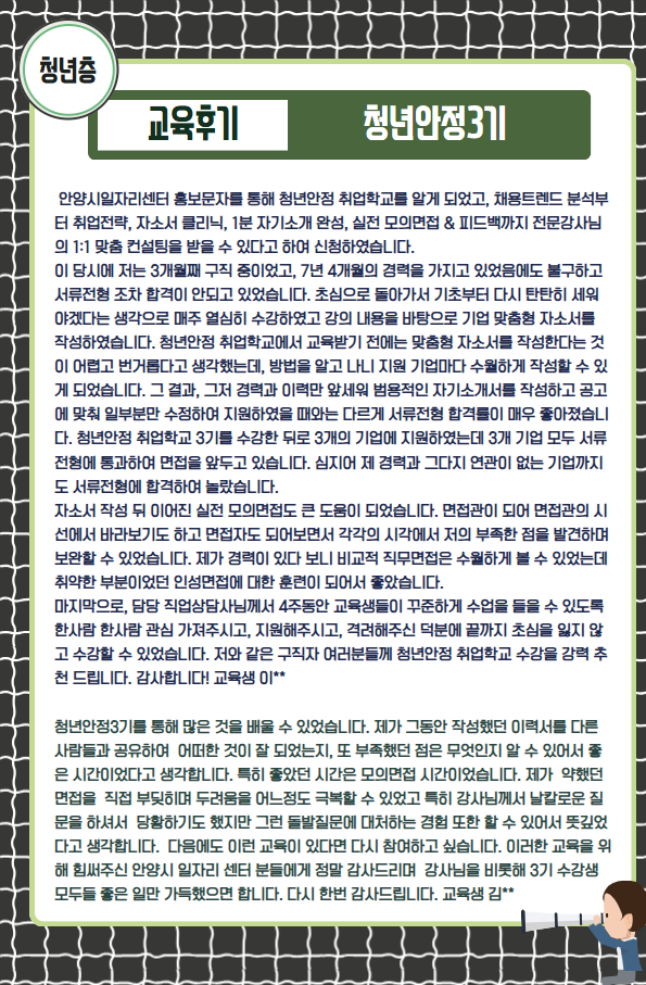 사진첩 링크복사 인쇄 블로그 페이스북 트위터 카카오스토리 카카오톡 알림마당 > 갤러리 상세보기 - 제목, 내용, 파일 정보 제공 [교육후기/청년층] 청년안정 취업학교 3기 내용 청년안정 취업학교 3기 사진 확대보기 파일 png 파일 [청년]교육후기_청년안정3기.png 미리보기 (파일크기 : 214.5KB, 다운로드 : 2회) 목록 이전글 [교육후기/여성층]취업스케치 2기 다음글 2025 제2회 청년 안양정착 일자리박람회