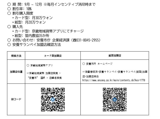 ニュース 暮らし情報 > ニュ?ス(새소식) 상세보기 - タイトル, 內容, 添付 정보 제공 安養サランペイ 民生回復 10%特別割引案内 內容 . 사진 확대보기 添付 png 파일 안양사랑페이_일본어.png 미리보기 (파일크기 : 75.7KB, 다운로드 : 28회) 目錄 前の項目 2025 安養縁故作家 発掘支援展 《私たちの時間は輝いている》案内 次の項目 安養ダンスフェスティバルについて