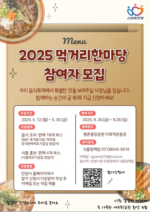 □ 모집분야 - 음식 조리, 판매 18개 부스(일반, 휴게음식점, 제과점, 즉석판매제조가공업 영업자) - 식품 홍보, 판매 4개 부스(식품제조가공업 제조업) □ 모집방법 : 홈페이지 참가 신청서 다운받아 작성 후 이메일(sjpark4079@korea.kr) 또는 직접 제출(안양시 위생정책과) * 안양시청 홈페이지 -> 시정소식 -> 고시공고 □ 행사기간 : 2025. 9. 26.(금) ~ 9. 28.(일) □ 행사장소 : 평촌중앙공원 다목적운동장 □ 신청문의 : 식품정책팀 ☎031-8045-5616 |