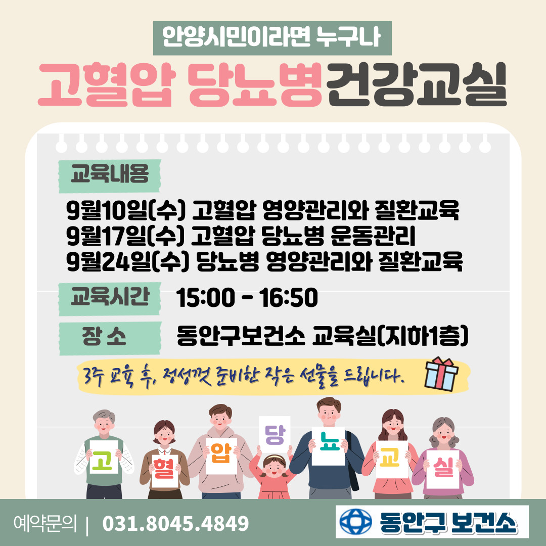 공지사항 링크복사 인쇄 블로그 페이스북 트위터 카카오스토리 카카오톡 로그인 공지사항 상세보기 - 제목, 지역, 내용, 파일 정보 제공 [동안구보건소] 9월 『고혈압·당뇨병 건강교실』 참여자 모집 지역 공통 내용 『고혈압·당뇨병 건강교실』 참여자 모집 사진 확대보기 파일 jpg 파일 9월.jpg 미리보기 (파일크기 : 254.6KB, 다운로드 : 26회) 목록 이전글 ★(8.13~8.14.)건강진단결과서(구,보건증), 결핵 검사 등 업무 일시 중단 안내 다음글 동안구보건소 유료예방접종 미운영 안내(8/19~8/29)