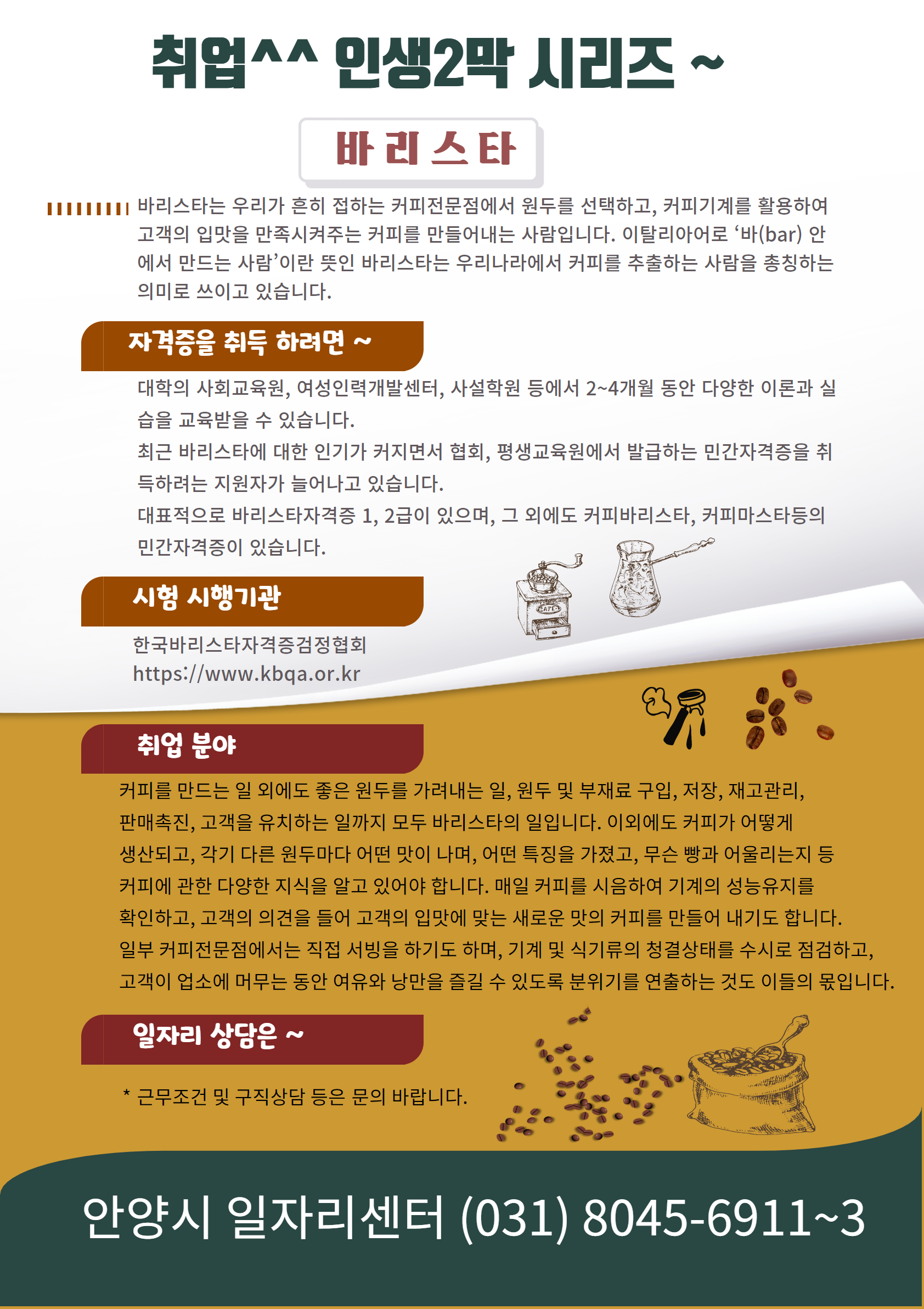 자료실 링크복사 인쇄 블로그 페이스북 트위터 카카오스토리 카카오톡 로그인 알림마당 > 자료실 상세보기 - 제목, 내용, 작성일, 파일 정보 제공 [직업정보] 인생2막시리즈10_바리스타 작성일 : 2020-06-25 내용 사진 확대보기 파일 png 파일 바리스타.png 미리보기 (파일크기 : 545.8KB, 다운로드 : 125회) 목록 이전글 [직업정보] 인생2막시리즈9_타일기능사 다음글 [직업정보] 인생2막시리즈11_수납정리원