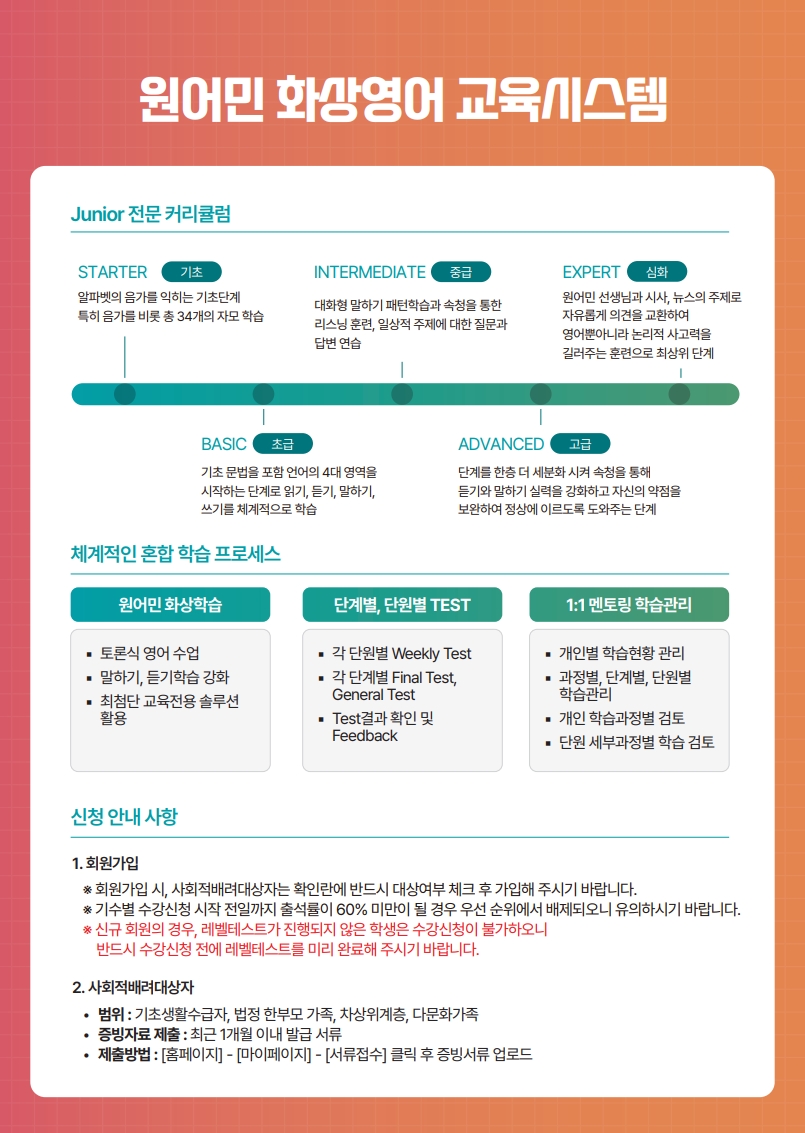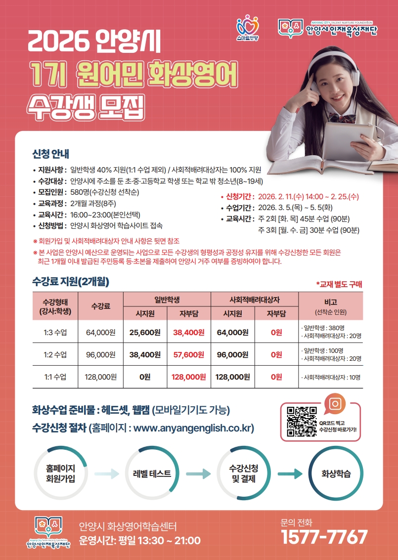 ○ 신청 기간 - STEP 1 (회원가입 및 레벨테스트) : 2026년 2월 9일(월)14 :00 ~ 2월 11일(수) - STEP 2 (수강신청 접수) : 2026년 2월 11일(수)14 :00 ~ 2월 25일(화) ○ 수업 기간 : 2026년 3월 5일(목) ~ 5월 5일(화) ○ 신청대상: 주민등록상 안양시에 주소를 둔 8~19세 청소년 ○ 모집인원: 580명(선착순 마감) ○ 지원사항: 수강료 40% 지원, (단 사회적 배려 대상자 100% 지원) ○ 신청방법 : 안양시 화상영어 사이트 접속 후 신청 원어민 화상영어(https://www.anyangenglish.co.kr/) ○ 문 의 : 1577-7767