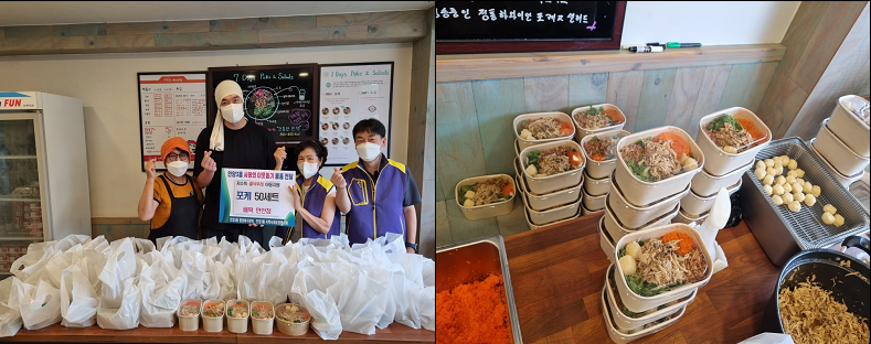 - (지원대상) 저소득, 한부모 가정의 결식우려 아동 50명 - (주요내용) 안양3동 소재 배떡 만안점(대표 김우중)에서 결식우려 아동을 위한 건강식 “포케(Poke)” 50개 전달 |