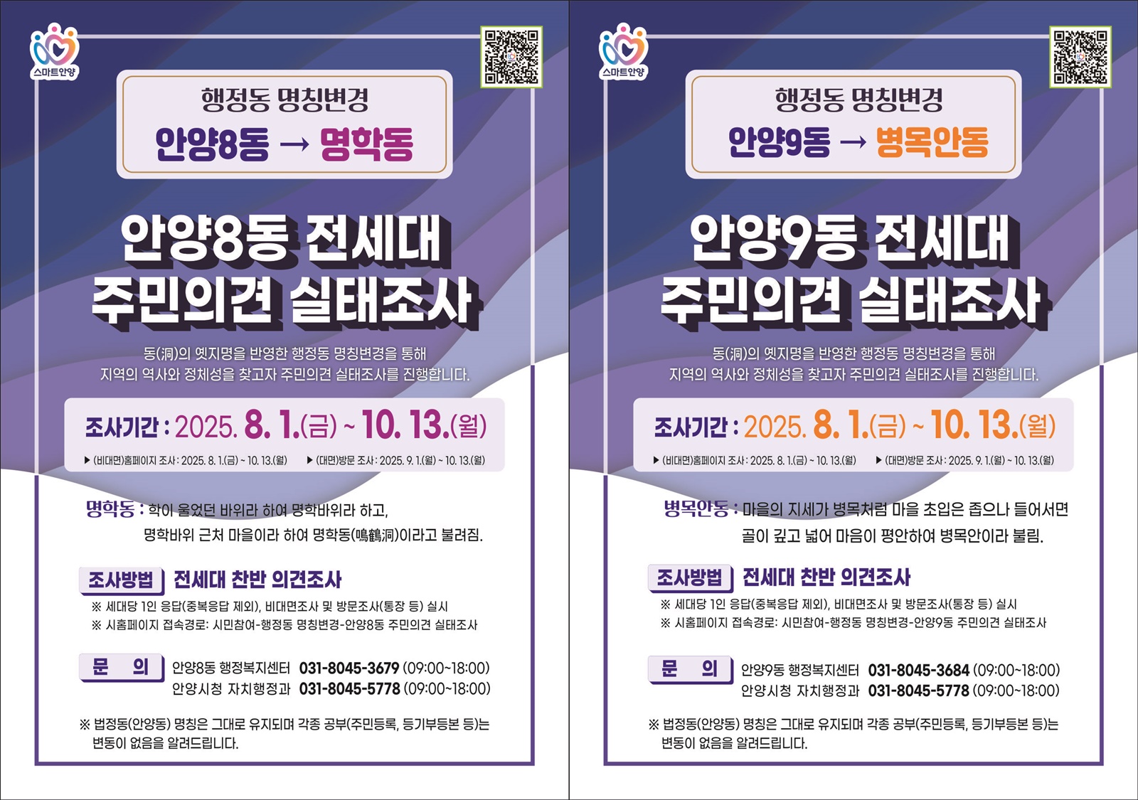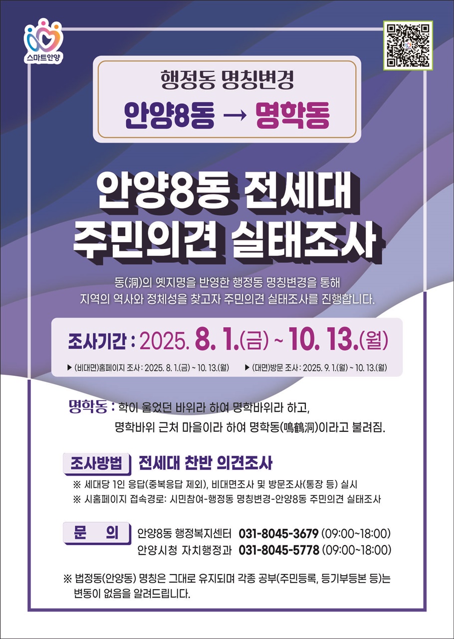 ‘옛 지명 찾기’를 추진 중인 안양시는 만안구 안양8동과 안양9동의 행정동 명칭변경을 위해 8월 1일부터 10월 13일까지 해당 동 전 세대 대상 주민의견 실태조사를 실시한다고 1일 밝혔다. 이번 주민의견 실태조사는 안양8동의 행정동 명칭을 명학동으로, 안양9동은 병목안동으로 변경하는 것에 대한 찬반 의견 조사다. 해당 동에 거주하는 전체 세대 중 60% 이상이 참여하고, 참여 세대의 과반수 이상이 찬성할 경우 명칭변경을 추진할 예정이다. 조사방법은 시 홈페이지를 통해 비대면 조사를 먼저 진행하고, 9월 1일부터 10월 13일까지 명칭변경추진위원회가 각 세대 방문조사를 실시하게 된다. 명학(鳴鶴)동은 조선시대에 학이 울었던 바위 근처 마을이라는 의미로 붙여진 이름이고, 병목안동은 마을의 지세가 병목처럼 마을 초입은 좁으나 마을에 들어서면 골이 깊고 넓어 마음이 평안하다는 데서 붙여진 이름이다. 지난 3월 안양8동과 안양9동의 주민자치위원장을 비롯한 지역 주민들로 행정동명칭변경추진위원회가 구성됐으며, 7월 회의를 통해 명칭변경안이 확정됐다. 안양시는 2024년 1월부터 석수3동, 관양1동, 관양2동의 숫자식 행정동 명칭을 옛지명을 반영한 충훈동, 관양동, 인덕원동으로 각각 변경한 바 있으며, 올해 7월부터 박달1동과 박달2동을 각각 박달동과 호현동으로 변경해 총 5개의 숫자식 행정동 명칭을 옛 지명으로 변경했다. 최대호 안양시장은 “안양8동과 안양9동의 옛 지명인 명학과 병목안은 지금도 역, 공원, 거리 이름으로 다양하게 사용되고 있어 인지도가 높고 지역 주민들의 변경 의지 또한 큰 것으로 안다”며 “앞으로도 지역의 역사성과 정체성을 담은 주민 주도의 행정동 명칭변경을 지속 추진해 주민 자긍심을 높일 것”이라고 말했다. 한편, 행정동 명칭변경은 법정동과는 무관하며 신분증이나 주민등록등․초본, 건축물대장, 등기부등본 등 각종 공부(公簿)에는 변동이 없다.